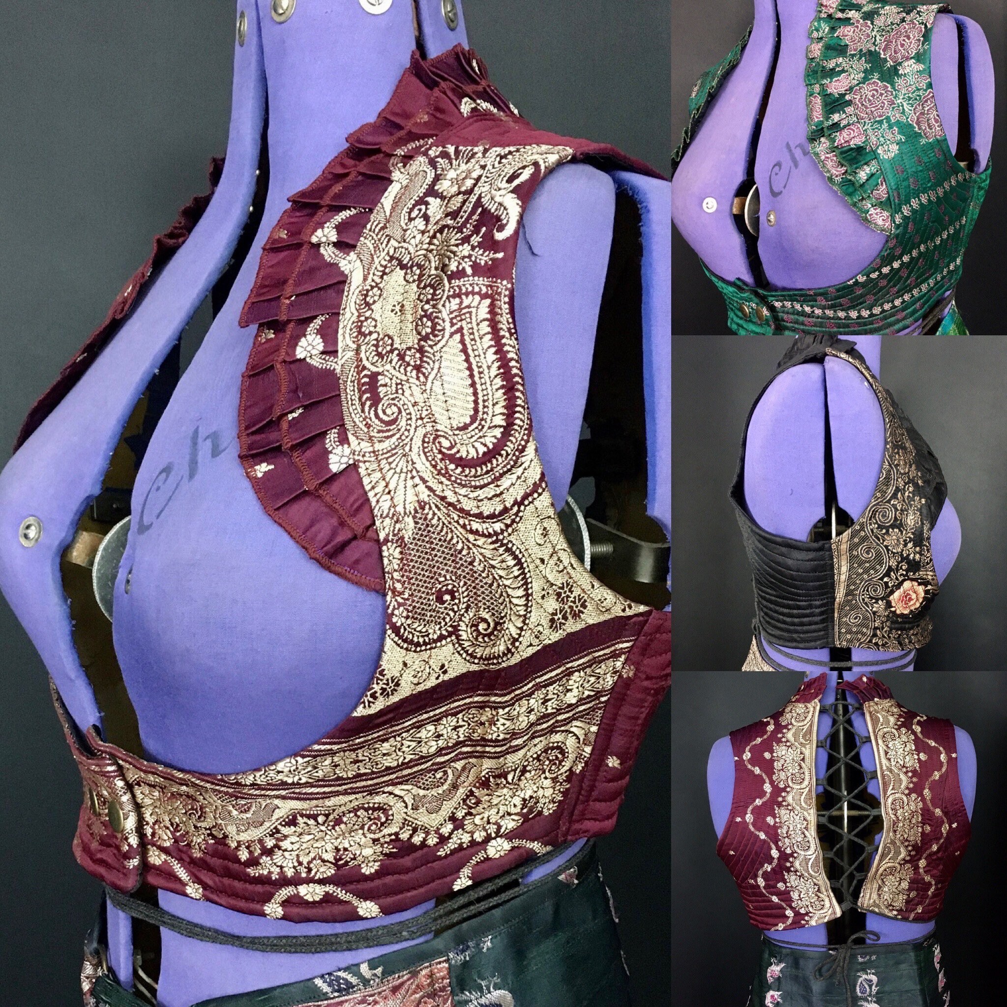This one-of-a-kind Underbust Corset Style Bustier Bra Top offers a comfortable fit, free of boning, crafted from exquisite vintage silk brocade saris. Handmade and repurposed, each piece is a unique work of art. Ideal for Steampunk, Burlesque, Renaissance festivals, REN Faire, Boho, Tribal, Bellydance, Gothic, Pagan, Fairy Fantasy, and Larp, it combines a quilted silk bodice with brass poppers on the front. The corselet back features an adjustable laced corsetage, providing versatility in sizing. From neck to hem, this bodice is fully adjustable, fully lined with black woven fabric, making it a versatile and stunning addition to any wardrobe.