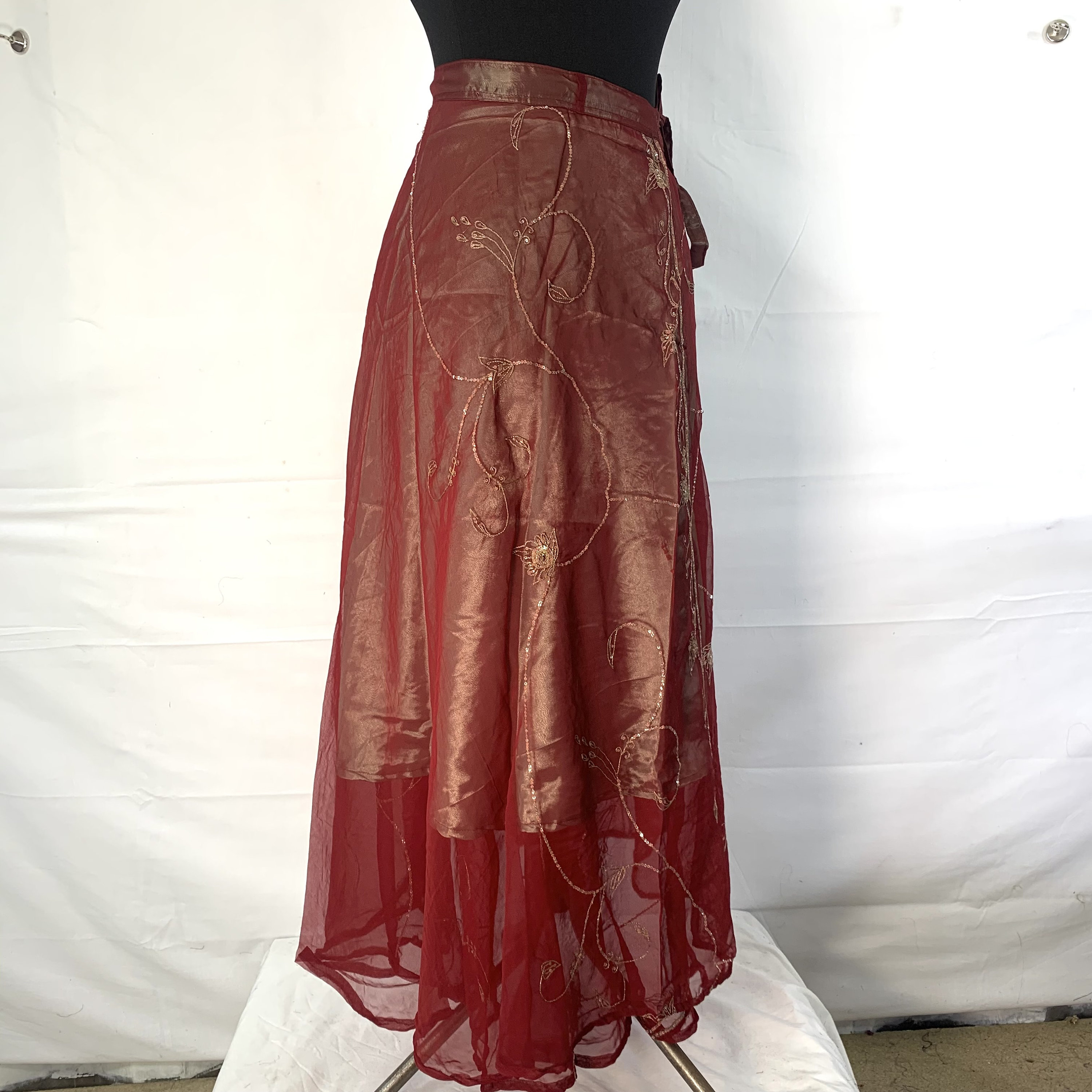 Our double layer Extra Long Lotus Flower Aari Skirt is a stunning decorative wrap around skirt that hugs your waist & hips, letting the elegant embroidered cloth do the rest! The vintage sheer outer material is elaborately decorated & finished in traditional Aari style. Handmade from fine quality vintage Silk saris ensuring every dress is unique just like you! In India, these sari are very popular wear at weddings and parties. The under-layer is a vibrant satin material that shimmers as you move. This Wrap Around Skirt adds colour & personality to any outfit, with two long and strong straps either end of the rectangular skirt that wrap around your body, fitting you perfectly. We make this style of wrap skirt in mini, midi, long & XL length. Skirt for Life! ❤️ Dress to impress 🌸