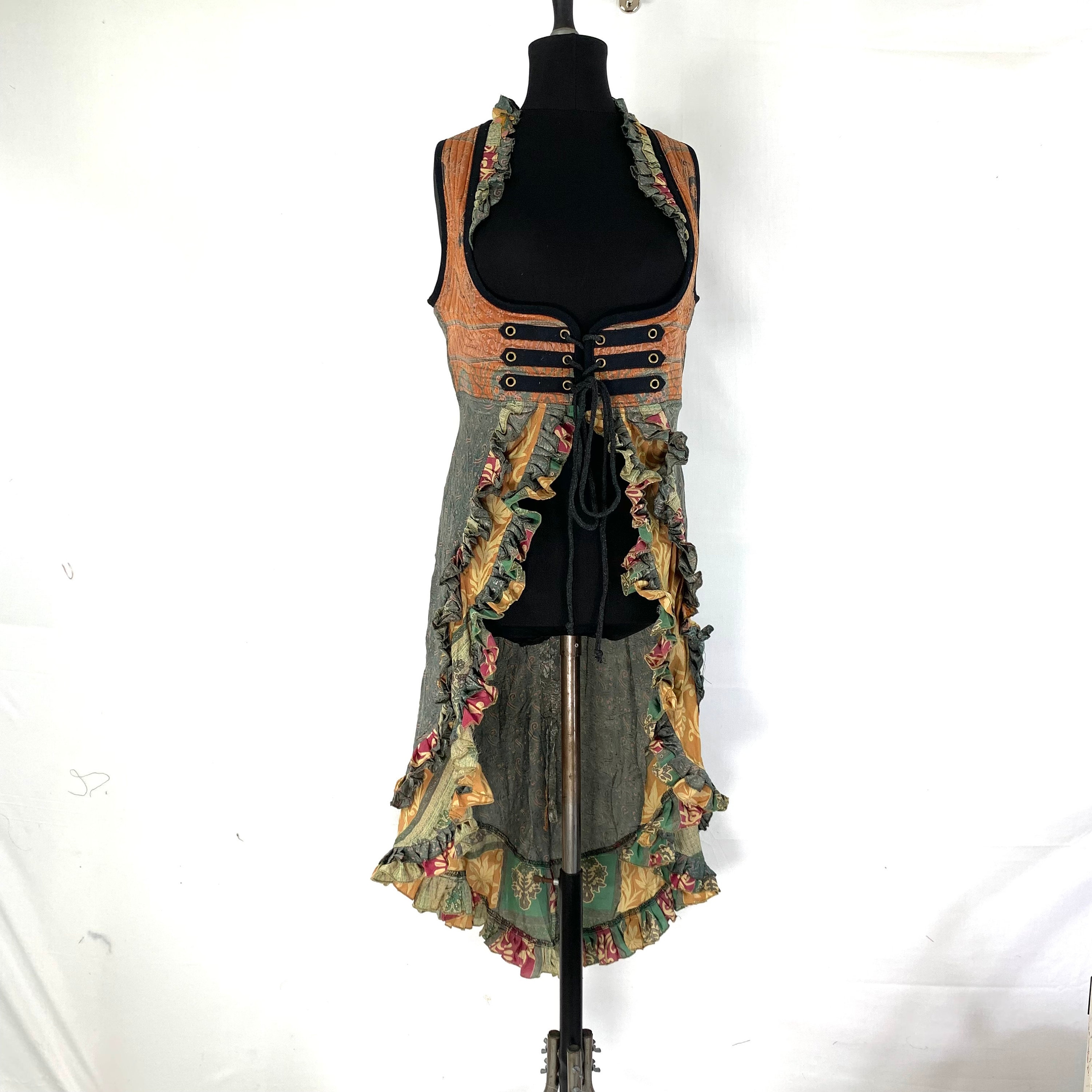 Silk Under-bust Corset Dress. A stunning under bust, Sleeveless outfit with an adjustable Corset Style Bodice. Beautifully tailored bustier with eye catching ruffles and lacing detail which combine for an eye catching corseted style tailed waistcoat / overdress that adds a dramatic layer to any outfit.