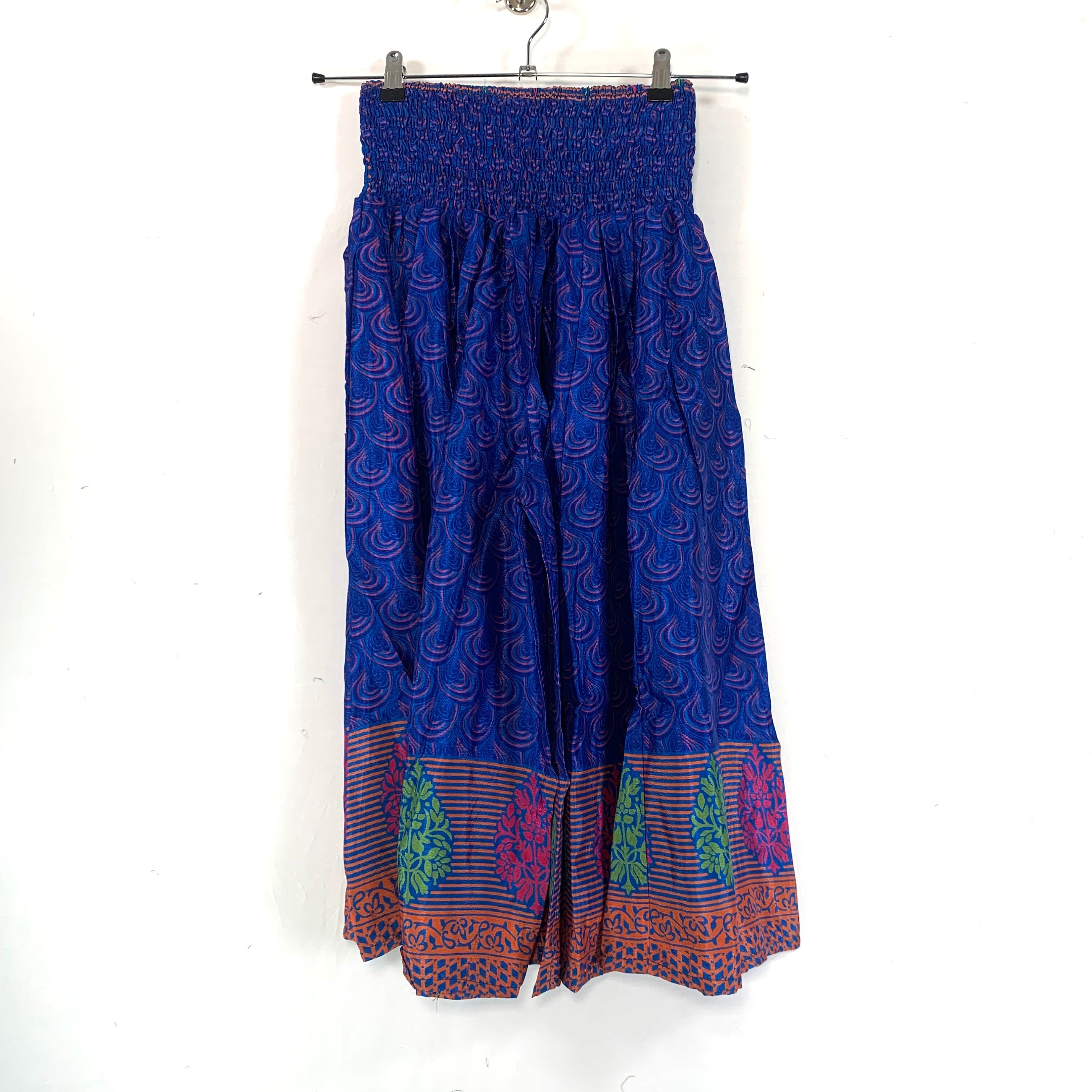 These Karma Suitsya Short Leg Silk Culottes are cut with a loose, extremely wide leg that flares out from the elasticated waist down to the ankles. We use elastic thread in shirring style stitching to create an expandable waistband which gives fabulous flexibility in the fitting. Culottes or Palazzo trousers are popular as a summer season style, as they are loose and tend to be flattering. They are made using light and flowing fabrics that are breathable in hot weather.