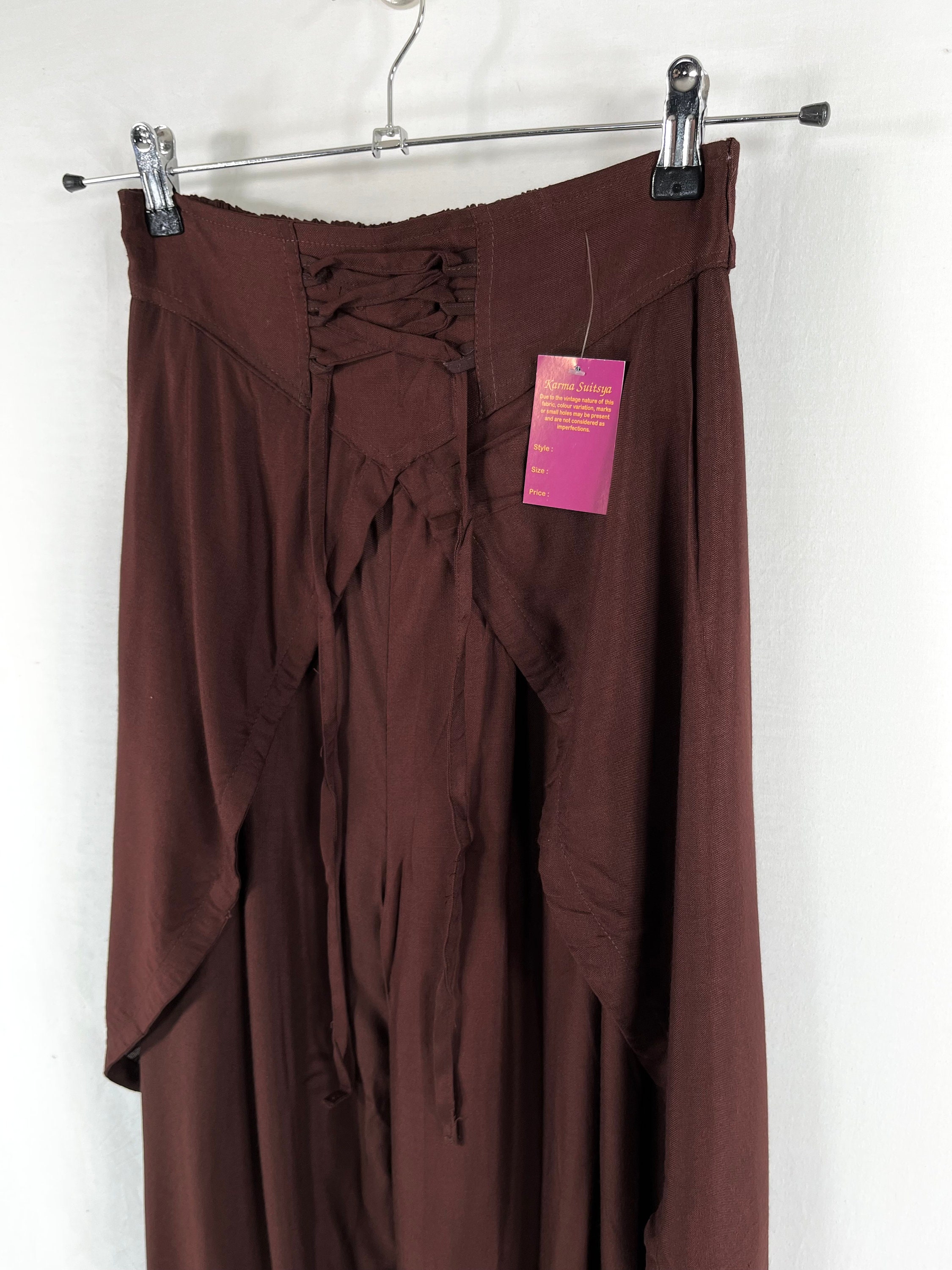These Elegant Brown Tulip Trousers are a comfortable loose fit and tailored to give you a very chic flattering shape, made from high quality dense soft Viscose Rayon fabric that flows and hangs beautifully. The longest point is at the inside leg. The length graduates upwards to a discreet slit at the sides. They are perfect for everyday wear, holidays or dressed up with a top.
