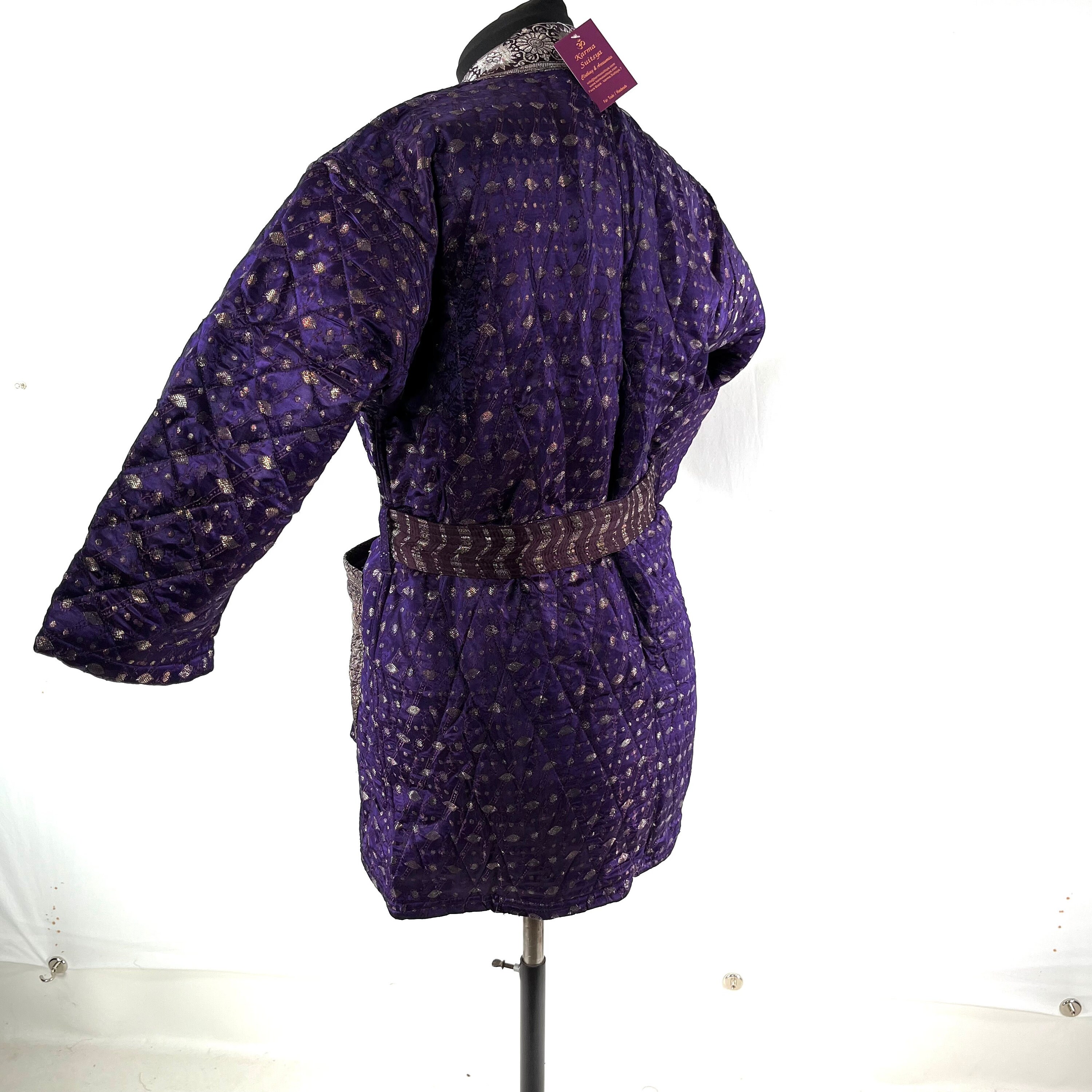 Designed as a unisex garment, this kimono jacket comes in generous sizing, allowing room for extra layers underneath. Whether worn indoors as a cozy housecoat or outdoors to make a statement at formal gatherings, it's a timeless classic suitable for daily wear or special occasions. What sets this piece apart is its eco-friendly origin – upcycled from vintage silk brocade saris, it not only showcases quality but also reflects our commitment to sustainability. Elevate your wardrobe with this unique, stylish, and environmentally conscious kimono jacket.