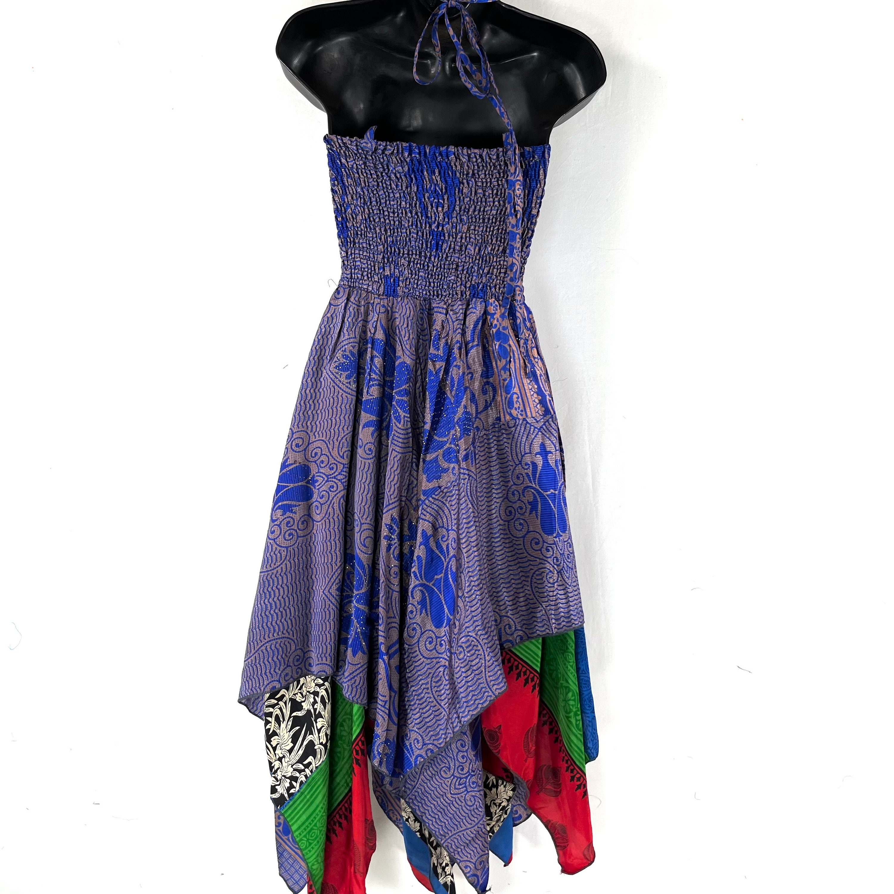 A beautiful Silk Summer Dress or a Skirt. This boho garment is incredibly versatile as it is fully elasticated & it can be worn over the bust or around the waist. Straps can be used straight through the loops at the back, tied at neck for a halter neck effect, or into a bow for a strapless detail.