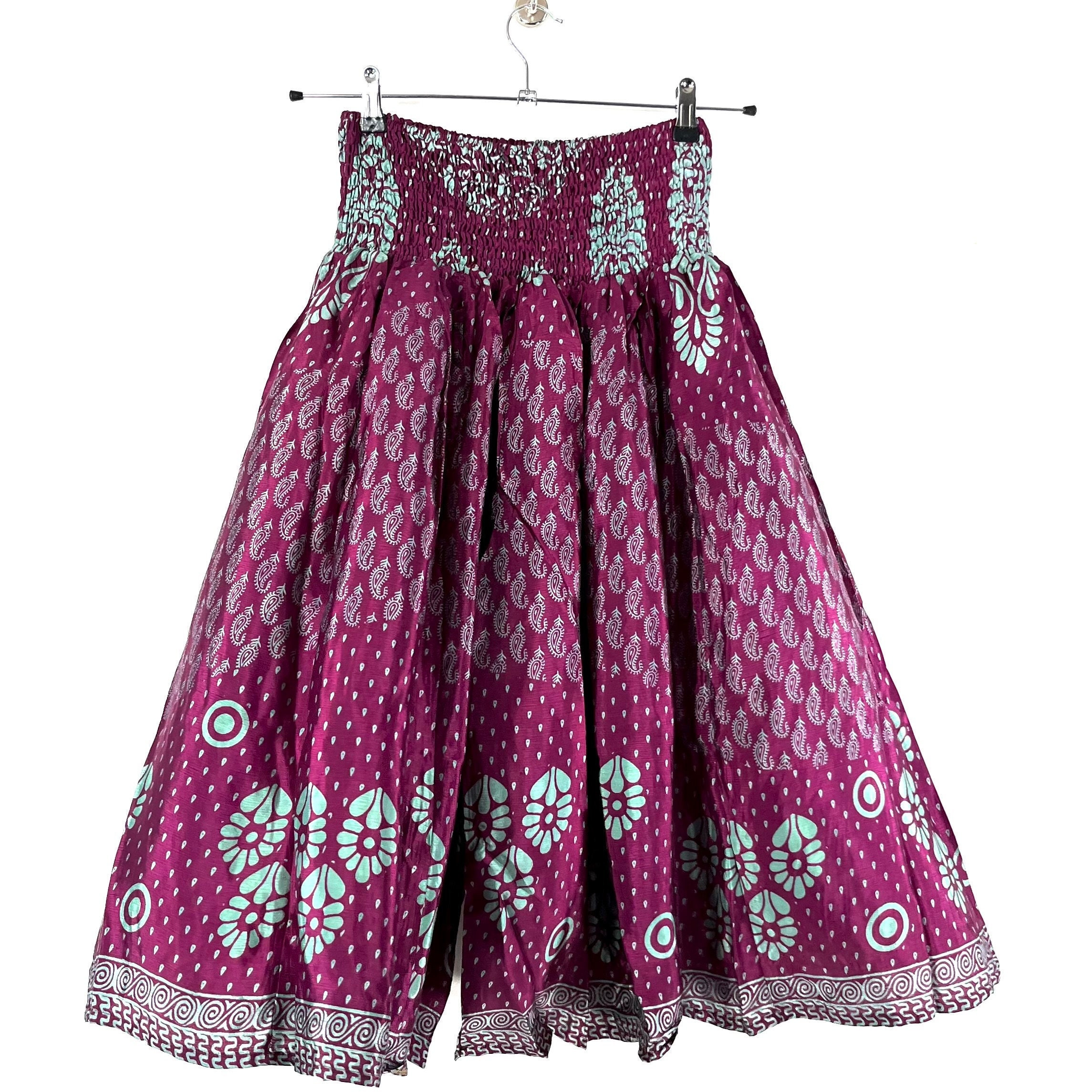 Karma Suitsya Short Leg Silk Culottes are cut with a loose, extremely wide leg that flares out from the elasticated waist down to the ankles. We use elastic thread in shirring style stitching to create an expandable waistband which gives fabulous flexibility in the fitting. Culottes or Palazzo trousers are popular as a summer season style, as they are loose and tend to be flattering. They are made using light and flowing fabrics that are breathable in hot weather.