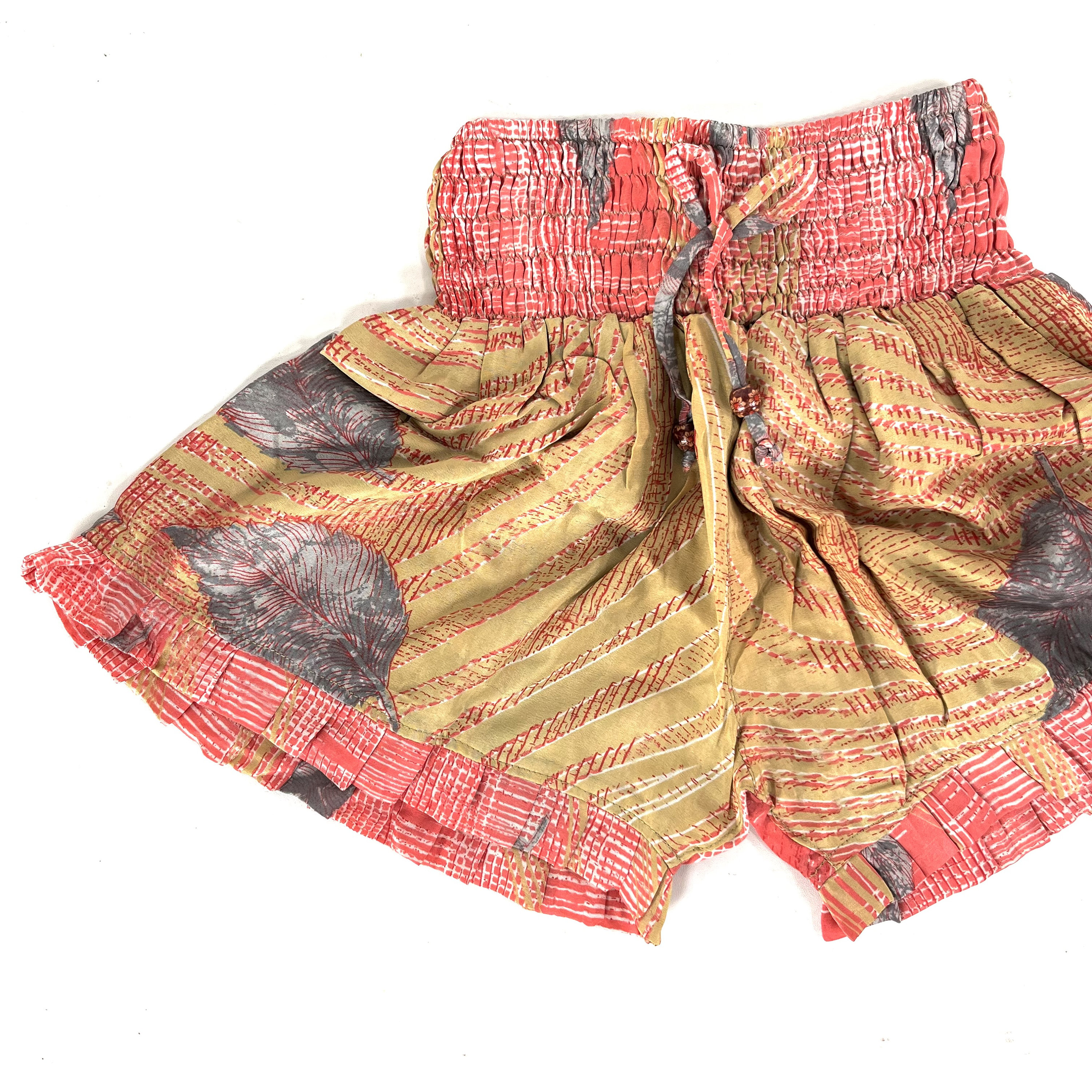 Lovely shorts fashioned from vintage sari. Stylish & comfortable. Features an elasticated bobbin waistband and some beautiful detailing for ultimate comfort. The beautiful light silk is soft and cooling against the skin. Perfect for sunny days, booty calls or just lounging in the house or nightwear PJ's