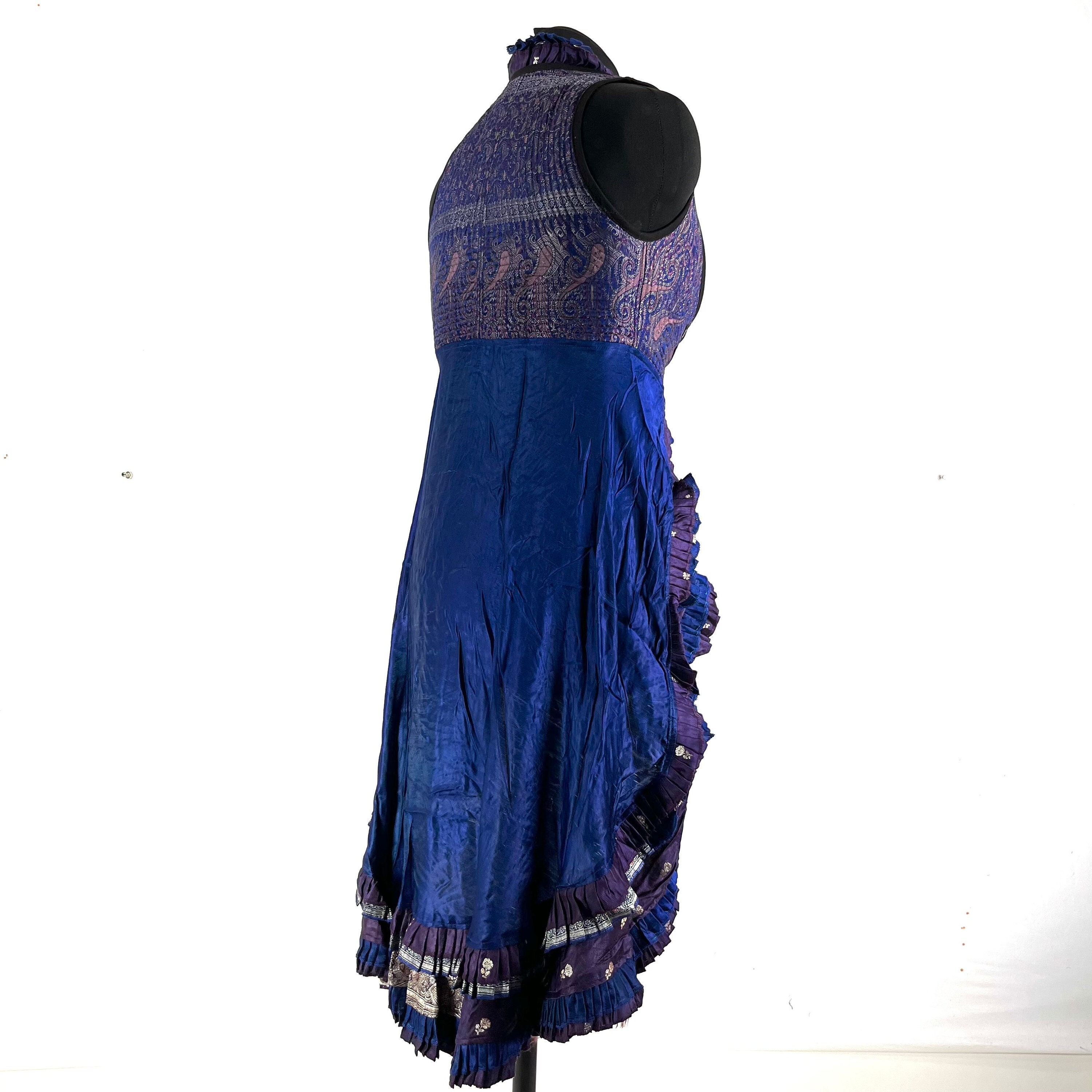 Distinctive details include a ruffled neckline, which is fully lined for comfort, & layered ruffles on a swag style tail. These handmade dresses are up-cycled from the very best, sustainably sourced vintage silk sari, ensuring every dress is unique just like you!