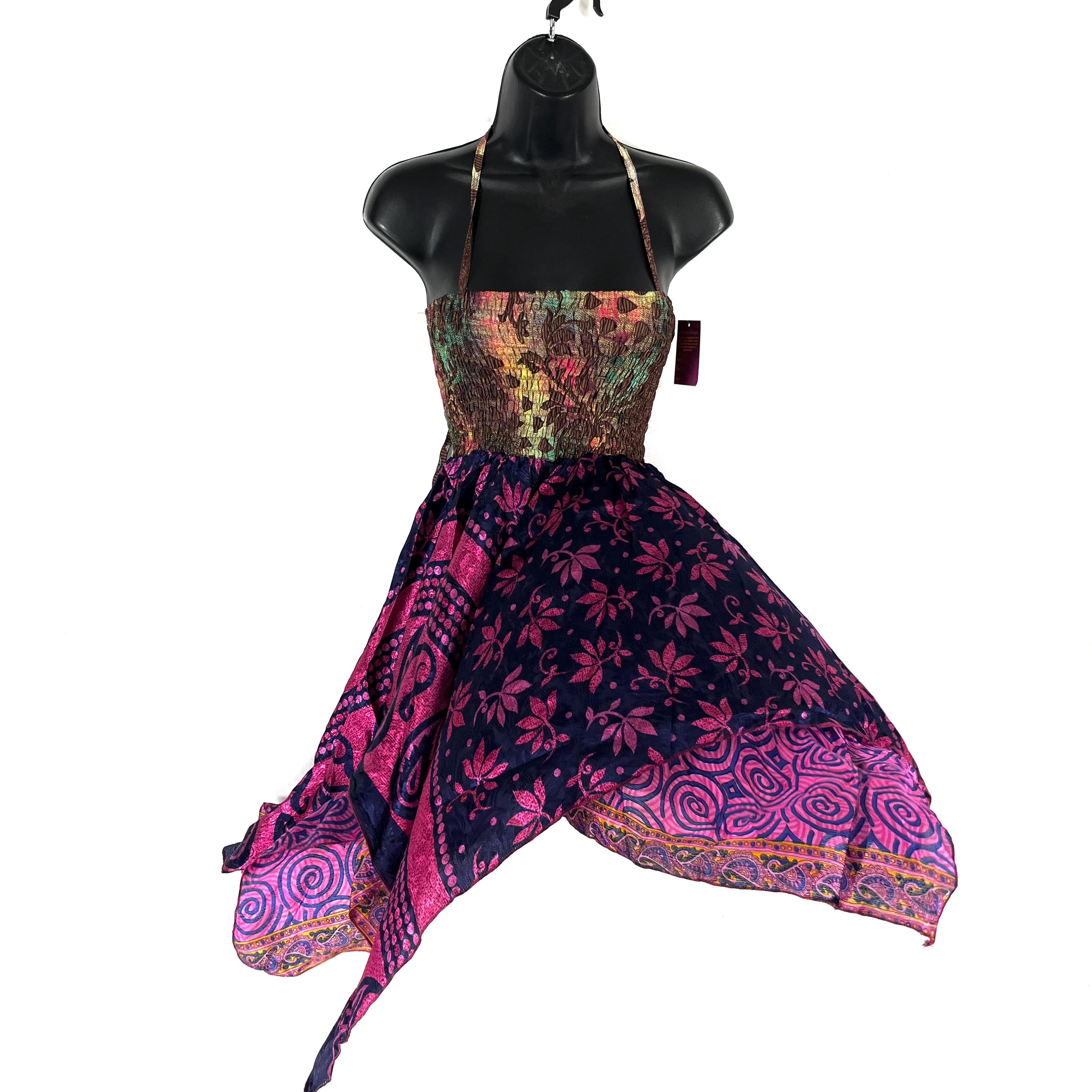 The Elvina Fairy Dress by Karma Suitsya is a one size, stunning silk garment. This pretty handkerchief dress has a luxurious double layer skirt with an elasticated bodice that is comfortable and easy to wear. It is created from fine quality, re-purposed sarees. Can be worn as a beautiful dress or a skirt. This boho garment is incredibly versatile as it is fully elasticated & it can be worn over the bust or around the waist. Straps can be used straight through the loops at the back, tied at neck for a halter neck effect, or into a bow for a strapless detail. The soft silks not only look fabulous, but feel fabulous too! This dress feels so lovely to wear and flows beautifully as you move. When worn as a skirt, it is easy to find a top to compliment the many colours in the fabrics & will leave you with a smile on your face These vintage sari are a mix of silk and either rayon or polyester.