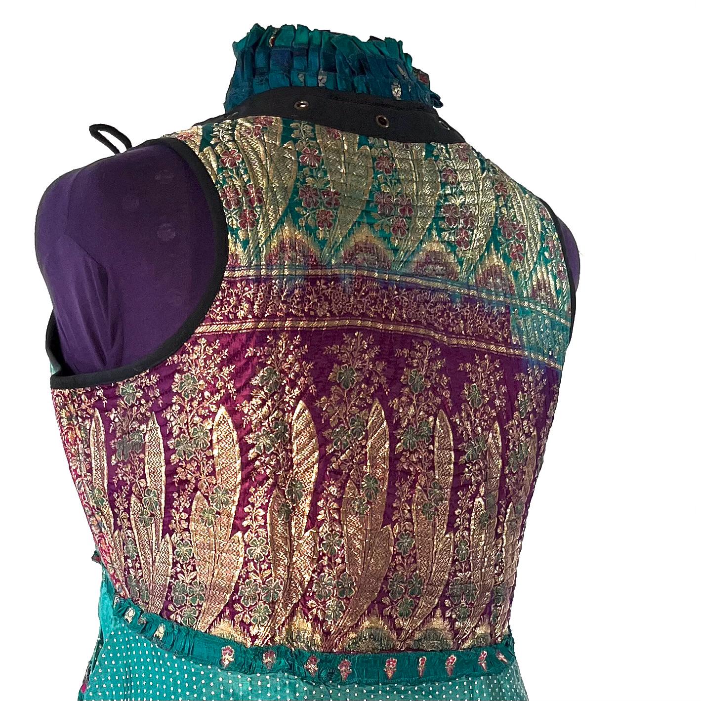 Steampunk style Corset Dress; A stunning over bust, Sleeveless outfit with an adjustable Corset Style Bodice. Beautifully tailored with eye catching ruffles and lacing detail which combine for an eye catching corseted style tailed waistcoat / overdress that adds a dramatic layer to any outfit. This unique piece has incredible detail, with delicate brocade silk satin mixed with a strong quilted bodice that fastens at the front with adjustable lacing. The lacing can be closed & pulled tight, or loosened & opened up to change the effect.