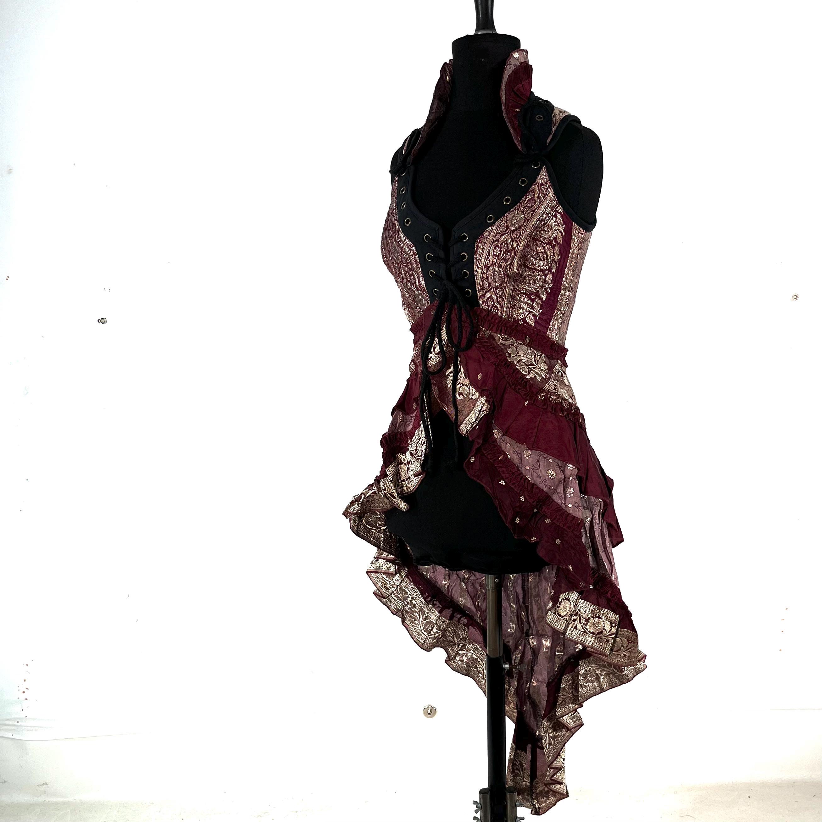 A stunning over bust, Sleeveless outfit with an adjustable Corset Style Bodice. Beautifully tailored with eye catching ruffles and lacing detail which combine for an eye catching corseted style tailed waistcoat / overdress that adds a dramatic layer to any outfit.