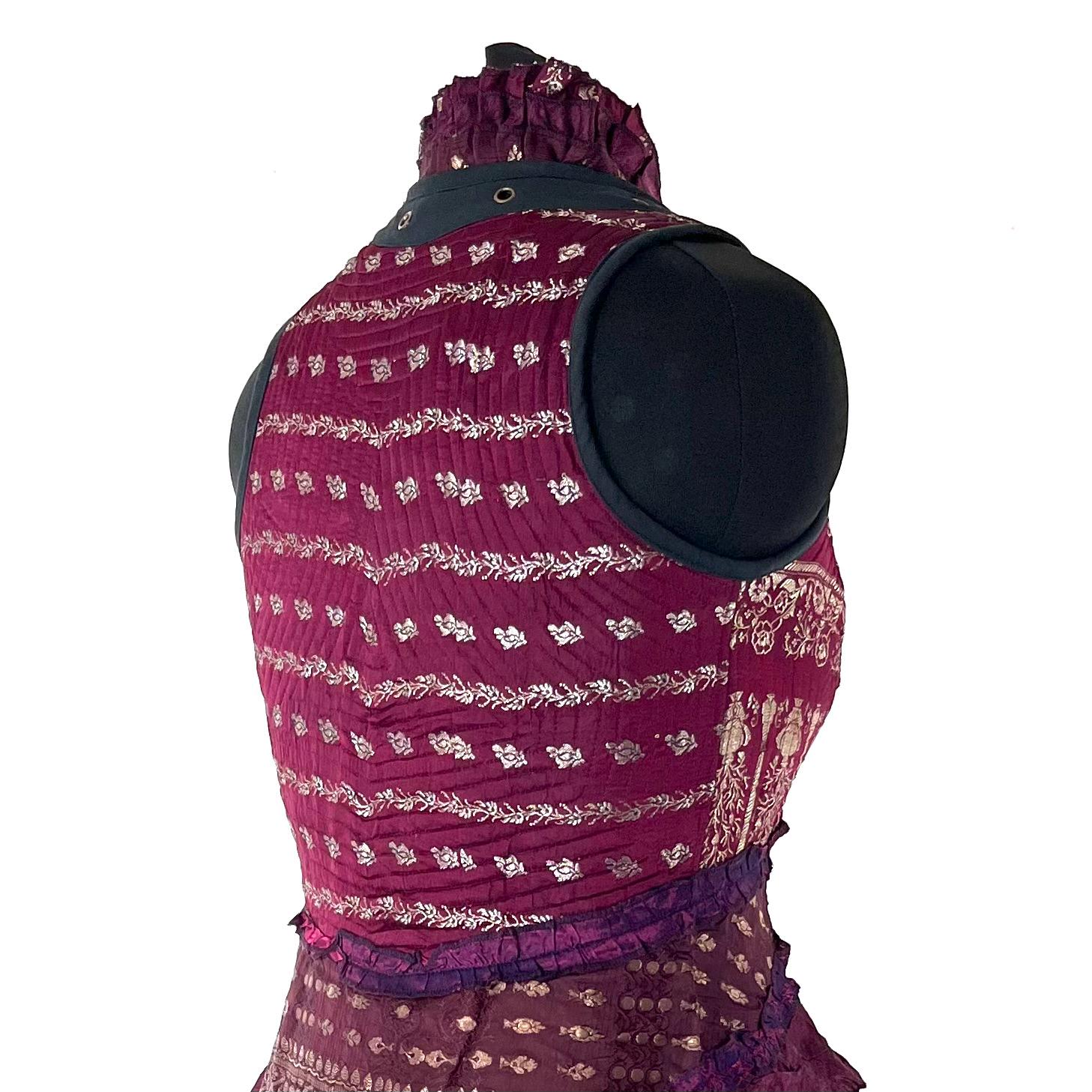 Steampunk style Corset Dress. A stunning over bust, Sleeveless outfit with an adjustable Corset Style Bodice. Beautifully tailored with eye catching ruffles and lacing detail which combine for an eye catching corseted style tailed waistcoat / overdress that adds a dramatic layer to any outfit. This unique piece has incredible detail, with delicate brocade silk satin mixed with a strong quilted bodice that fastens at the front with adjustable lacing. The lacing can be closed & pulled tight, or loosened & opened up to change the effect.