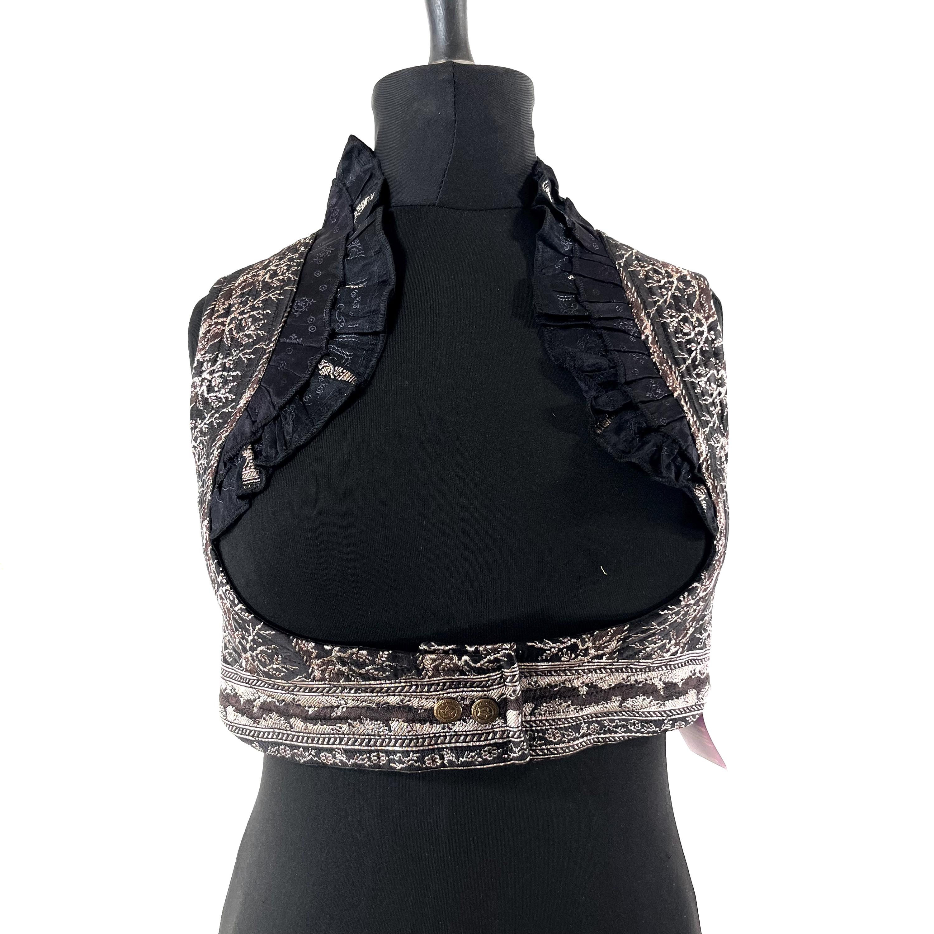 This one-of-a-kind Corset Style Bustier Bra Top offers a comfortable fit, free of boning, crafted from exquisite vintage silk brocade saris. Handmade and repurposed, each piece is a unique work of art. Ideal for Steampunk, Burlesque, Renaissance festivals, REN Faire, Boho, Tribal, Bellydance, Gothic, Pagan, Fairy Fantasy, and Larp, it combines a quilted silk bodice with brass poppers on the front. The back features an adjustable laced corsetage, providing versatility in sizing. From neck to hem, this bodice is fully adjustable, fully lined with black woven fabric, making it a versatile and stunning addition to any wardrobe.