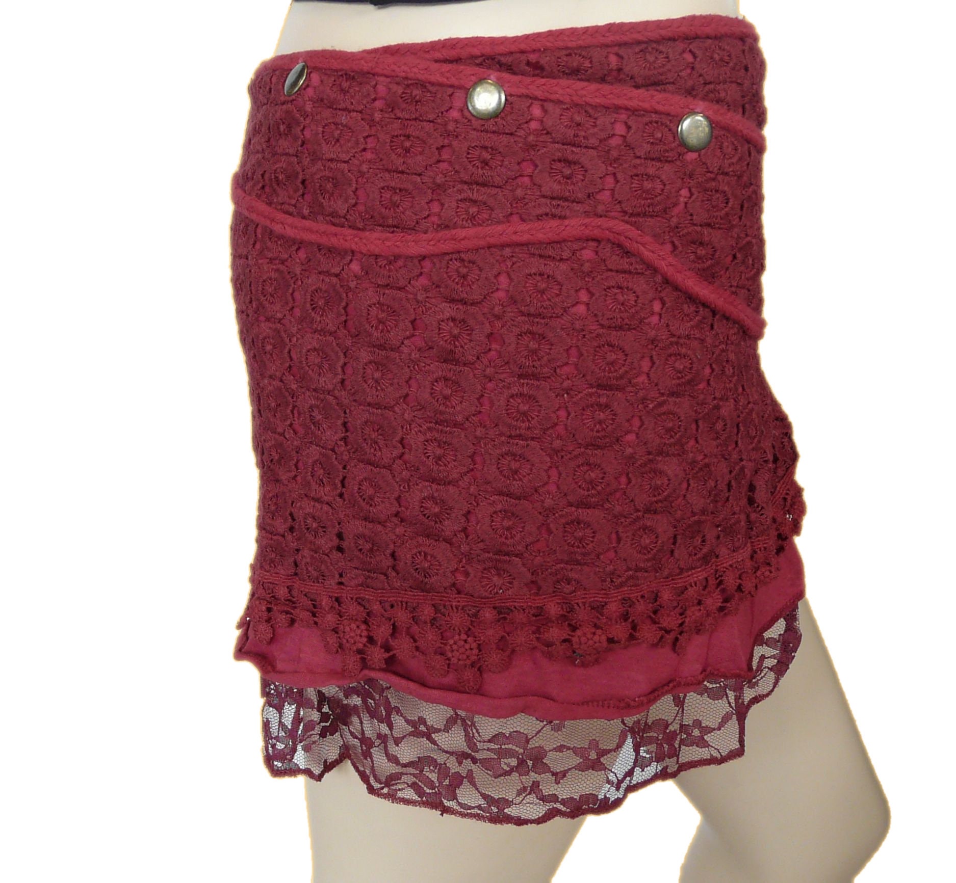 Elevate your style with our handmade pixie-inspired short cotton skirt. This Red mini wrap-around skirt features a multi-popper fastening for a customizable fit, enhancing your shape with a slight angle. The intricate lace and crochet details add a touch of bohemian charm. The detachable purse adds versatility for a night out, while the multi-layered design ensures a unique and eye-catching look. The skirt's vibrant hue appears to change in different lights, offering a dynamic and karma-infused style. Embrace the hippie chic boho vibe and make a statement with this one-size, fully adjustable, and effortlessly stylish cotton skirt.